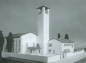 | Baubeginn 1933, Kirche mit Campanile und Pfarrhaus. |