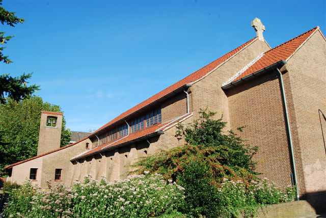 | Dieser "Typ S" ("S" für Staudacher) ähnelt dem von Bartning zusammen mit Dörzbach, Wechssler, Staudacher u. a. entworfenen Typ A (Schwesterkirchen in und t/Main), dessen Entwurf schwerpunktmäßig Ing. Emil Staudacher (Zürich) zugeschrieben wird. Restaurierung 2000. Warum diese Kirche nach Holland kam (evtl. aus dem "Notkirchenprogramm"), ist nicht bekannt. Wer kann helfen? |