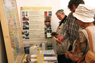 Schriftenstand mit Deutschlandkarte der Bartningkirchen und Schautafel zu den Berliner Bartningkirchen